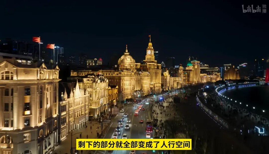 外滩曾经有12条车道,车水马龙拥挤不堪,行人步行体验很差。