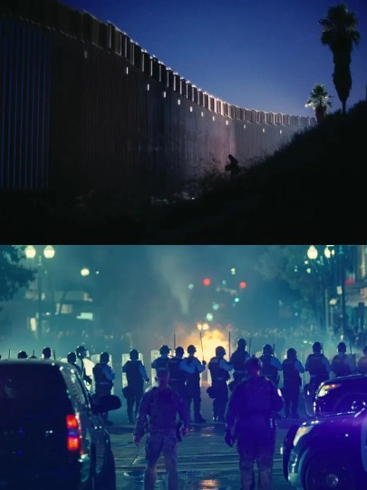《一战再战》中,序幕与主干的情节通过Willa在跆拳道馆中仪式性的鞠躬一分为二。从逻辑上我们可以理解这中间度过了16年,可当我们从建筑、服饰等环境塑造入手时,却很难发现16年前后的差别。通过对PTA创作灵感的来源与主题的把握,对于这样的呈现方式就不难理解。本片取材自《葡萄园》,一个关于1984年的反叛者之女回望6、70年代运动的故事,将“地下气象员”和“黑豹党”与片中“French75”联系在一起的评论也屡见不鲜,这是其复古气质的来源;难民营、安提法组织以及拉美移民等具备当下性的议题也在片中可以找到影子。具备安那其主义气质的French75和更符合大卫·格雷伯对安那其主义者定义的“Sensei团队”在16年前后交相辉映。三个拉美孩子黑夜中在楼顶上跑步,如海浪般高低起落。对PTA来说6、70年代面对的问题和情绪和如今高度重叠,一切就像浪潮推进,看似是向前滚动的运动,但海岸线仍在那个位置。这是一种混杂着消极与积极的复杂情绪。视觉方面,影片完成了同构,但在时间性上,PTA做出了区分。